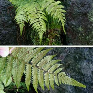 愛知県内にある妻の実家に帰省中です。家の目の前にある石垣から立派なシダが生えていましたのでパチリ。雨に濡れて質感もアップ。この垂れ具合がとても好きです(笑)。このシダは名前は何と言うのでしょうか。よく見かけるシダですが、この形のものは似ているものが多く難しいです。何の仲間、程度でも分かればなと思います。平野部で、周囲を田んぼに囲まれた家の石垣に生えていました。