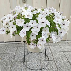 「サフィニアアート るりいろ風ぐるま」です✨ 白いお花に紫色の筋がスッと入り、涼やかなお花です💜 本当に風車のようですね・・・🥰 最近のサフィニアやペチュニアは様々な種類があり、育てるのがとても楽しいです🎶