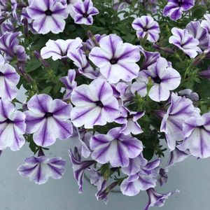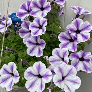 SUNTORY サフィニアアート るりいろ風ぐるま🤍💜𓈒𓂂𓏸♡ きのうからの雨がお昼すぎにやっと上がりました☁☁☁ 株が乱れて真ん中にお花がないるりいろ風ぐるまさん。 写真を撮ったあと切り戻しました(∩^o^)⊃━☆゚.*・。