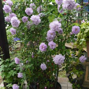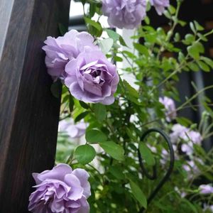 今日のバラ① レイニーブルーの全体像。 昨日太陽の下に置いておいたら、あっという間に開いてしまいました。また雨が降ってきたので軒下に避難。今でほぼ満開かな。花が開いてみれば結構咲いていますね! わーい\(^o^)/ 昨年より確実によく咲きました👍 10号深鉢(フレグラープランター30cm)植えで、湾曲したトレリスにからませていて、トレリスの上端が120cmくらいです。花首もあまり伸びないので鉢植えでの収まりは抜群です😊 ただ、あまり勢いよくシュートが出ず、伸びもいまいちなので、今ある枝を毎年大切にしています。逆に言えば古枝にもそこそこ咲くため、新枝を伸ばす算段をしなくていいので楽ちんかも😁 アンジェラも古枝に咲いてくれるので、切るだけでもよく咲いてくれて楽ちん。ロンサールは新枝咲きだから、毎年解体が必要で大変。と、バラにも一長一短いろいろありますねー😅