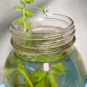 メダカ🐡ちゃんがいます。 水草がビンからはみ出るとカット✂️していたけど、放置していたら花が咲いていました☺️