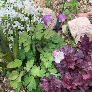 風鈴オダマキ 小さい花が 可愛い~ 葉の形も可愛い~ けど うっかりすぐ横から カサブランカがでてくるし、芝桜とヒューケラもモリモリしてきて 密集地帯に💦 引っ越さないといけないかな?