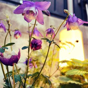風鈴オダマキ 紫と白の2色遣いが素敵ですよね♪ ガーデンライトで照らしてみました (* ´ ▽ `)ノ💡✨