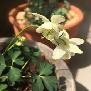 先日お迎えした風鈴オダマキです☺️ 後ろの鉢も新入りさんのオダマキ、チョコレートソルジャー。もうすぐ咲きそうで楽しみです。