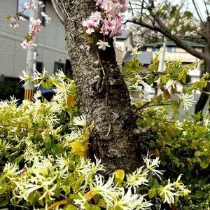 垣根の白い常盤万作が咲き出しました。 年中咲いてる十月桜だけど、やはりこの時期が一番豪華❗️ 春爛漫🌸🤍.。❁*.:。❁