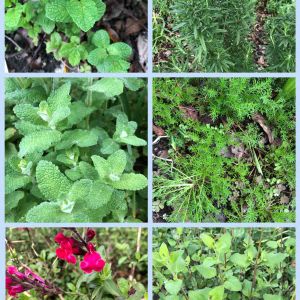 今日のお花💐 ペパーミントとハーブ🌿達です♥︎︎∗︎*゚ 左上から ペパーミント レモンバーム チェリーセージ 右上から ローズマリー ローマン.カモミール サルビア.ホットリップス 八重桜🌸の木の下で 育ってます♥︎︎∗︎*゚