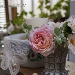 曇りの1日… 今日のお花がアジサイ、そうだ庭のカシワバアジサイの剪定しようっとと作業した。 玄関脇のピラミッドアジサイも✂️。 緑んになった花と咲いていたバラ・オーブを一輪入れてアジサイアレンジ〜