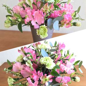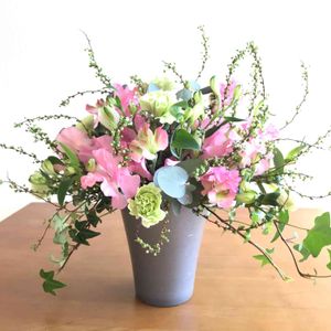 前回投稿したアレンジメントのその後です。レッスンでは時間が足りなそうで、途中でやめたユキヤナギとアイビーを追加しました。基本のドーム型を作ってからちょっと飛び出たりふんわりしたラインを入れても良い、との事で… でもちょっとやりすぎたかな?😅
