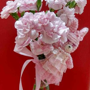 私はこのお花から生まれた妖精✴🐰 ̄(=∵=) ̄❇🌠✴ 切り花 カーネーション 同じ色の毛糸が(^ω^)…🐰 オリジナルで編んだので不細工に(笑)