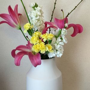 おはようございます😊☁️⛄❄️ 今日も寒いですね❄️今日は仕事お休みの日で明日も。連休は嬉しいですね〜🥰 今日の午後からトールペイント教室に行ってきます。もうすぐ作品が完成間近なためテンション上がってます✌️😆✌️ こちらのpicは先日の定期装花のオリエンタルリリーが次々に咲いてきましたので花瓶を変え花材もちょっと入れ替えました。ガーベラがやはりダメになってきたためスプレーカーネーションと梅の枝と入れ替えました。 ガーベラとはまた違った感じです🌷💕 百合の花が意外に大きかったのもあり大きめの花瓶が欲しくなり…器といい出会いがあったので購入!この花器もお気に入りになるでしょう🎶 お花の良さが引き立つ花瓶だなあとすごく自己満足してます😆