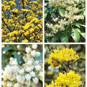 山の神社の周りにも、春らしい花が咲き始めました。 青空に映える黄色は、サンシュユの花です。12月には赤い実がいっぱいになるので、また訪れてみたいです。 白い花は、馬酔木(アセビ)です。 花はスズランに、似ています。咲き始めは、口笛を吹いているみたいで可愛いですよ。左下は拡大してみましたので、ご覧下さいね。