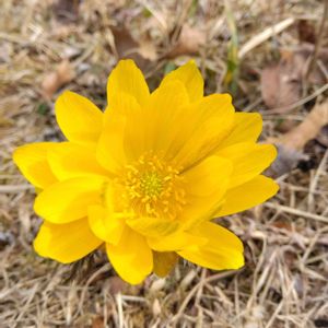 フクジュソウ 念願の福寿草に出逢えました。 早春に葉を茂らせる前に花を付け、初夏には休眠に入る早春植物のひとつです。 花は晴れた日に開き、曇りや雨の日は半開きとなります。 開花期間が長いため、「長寿草」という別名があります。