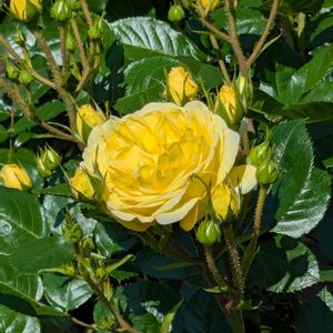 この春に手に入れた黄色のバラ、「ベル・ロマンティカ」 一個だけ咲かせてあとは摘雷して、秋に向けて育てます 最初は夏バテ気味だったけど、最近は新芽も出てきてくれました😌