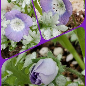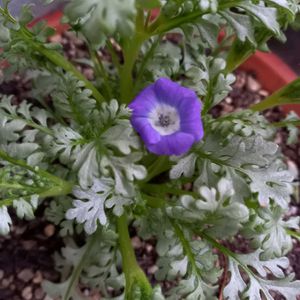 おはようございます👋 ネモフィラ プラチナラベンダー💜 先日お迎えしたネモフィラ💜 シルバーリーフ🌿に紫のお花が 咲きました💕🎶 去年お迎えした青色のネモフィラは こぼれ種で苗も小さいですが春には 青と紫が一緒に咲く日が楽しみです 💙💜(*^ω^)