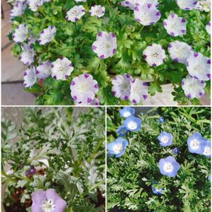 ネモフィラ プラチナスカイ(左上)につづき プラチナラベンダーも咲き始めました❤(ӦvӦ。) 下の2つがそう(?)なのですが、 右下は正解! 葉もプラチナカラーで 花も少しピンクっぽさがあるラベンダーカラー でもお花がちっさすぎ〜🤭 可愛いから許す💘 しかし左下は 葉がみどり 花は??? 紫っぽいです。 これは…新種?mix? それともこういうネモフィラもあった???笑