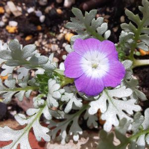 今日のお花 ネモフィラ 大好きなお花です シルバーリーフがきれいな プラチナスカイとラベンダー まだ苗が小さいけれど お花が咲き始めました。