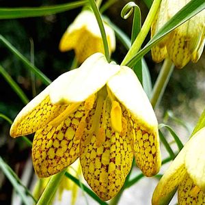 お気に入りの散歩道に ちょうど今、 たくさん咲いています♪ 🏷️今日のお花 「バイモ(貝母)」 編笠百合とも呼ばれる由来の 模様と葉っぱのクルクルが 魅力的💓 地下にある鱗茎を乾燥 させると生薬になります。