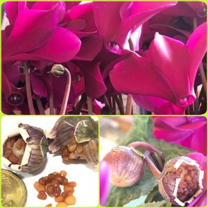 シクラメンの種が採れました‼️ @マロママさんに、網被せて受けれるようにねと教えてもらって、ずっと観察してました。 いつまで変化無し😣 一昨日、そうっとのぞいて見たら、 ちょこっとはじけて中が見えた。 そうっと外すとタネがぽろぽろ❣️ 初めて、種を見て感動です🎶😁 嬉しい〜😁 🏷ちっちゃいものクラブ