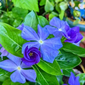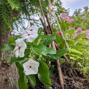 ニチニチソウの寄植え。手編みのかごで、ハンギングバスケット パンジーから、植えなおししました。