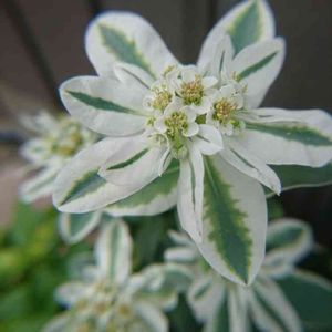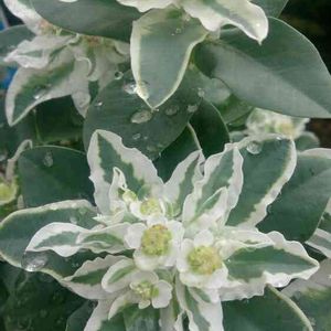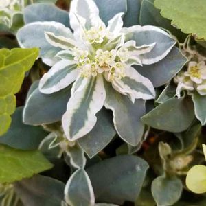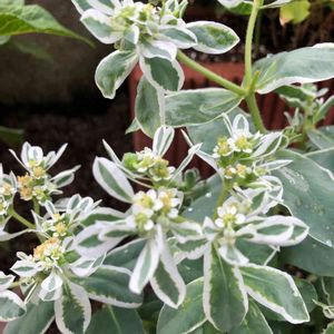 おはようございます😃 朝方、雨が降ったようですが今始まる止んでるので庭パトです❣️ 新しく迎えたユーホルビア 氷河⭐️ 白い小花で斑入りリーフが可愛いです💕