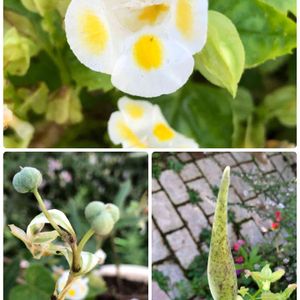 パピーさんのリクエスト!黄色のトレニア🤗 しゃーねなぁー。(仕方ないなぁ)と言ったけど、 一緒に寄せ植えしていた ユーホルビア(左下),ブルースター(右下)が こんな種を作っていたよ。😵💦 ポピーちゃーんありがとう💕💕💕💕💕 このまま自然に、こぼれ種でまた来年 咲かないかなぁ? あっ!取って置いても、忘れちゃったり 捨てたり、わからなくなるから ゴメン😅