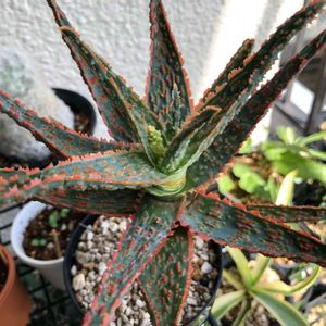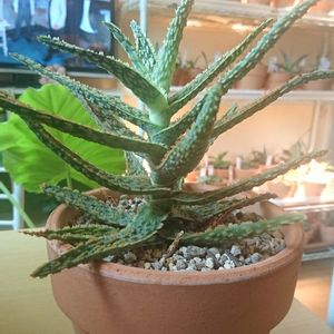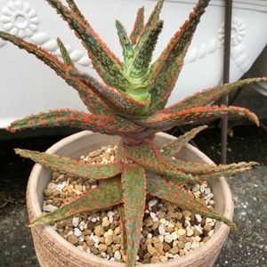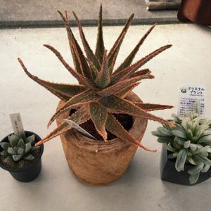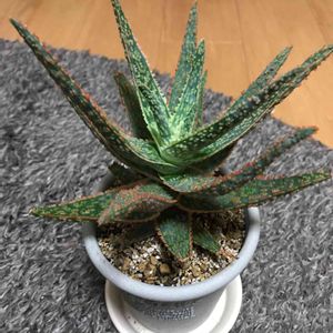 アロエ フラミンゴ、半額セールで以前ゲットしてやっと鉢に植え替え。 根が予想以上にギッシリで、大きいかと思った4号鉢もちょうど良さげ。 下のほうは先が赤いけど、上のほうは緑のまま。赤くする方法などあるのでしょうか? いつもは窓際カーテン越しですが、今洗濯物が見える😅ので床に置いています。