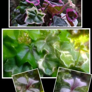 おはようございます👋😆☔️ 🍀アイビーゼラニューム🍀 💞 エレガンテ💞 上→去年の暮れ、 カラフルな葉色に惹かれ💓 お迎えしました🎵 下→現在はほぼ緑色の葉💚に、 初めての花が咲きました💠💠 ゼラニウムらしく、葉に比べ大きめのお花です🤗