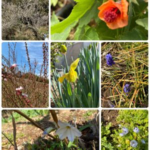 畑の片隅 ちょっと行かないと、 あちこちに咲いてました❤️ お天気も良く、暖かかったーー❣️ 草も元気よかったよー💦 ↖️梅の花そろそろ終わりかな? ↗️アブチロン一輪。これは、お庭です。 ⬅️ピンクのユキヤナギ、咲き始め。 ⏺水仙の花、かじられてる💦 ➡️ムスカリが咲いてた。葉っぱがショボい ↙️紫陽花の根元から、花ニラも。 ↘️零れ種からのネモフィラさん。 たくさん出てますよ。