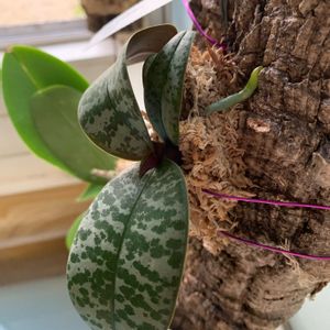お風呂場に戻ったファレノプシス・シレリアナ💚 新葉もかわゆい💕 伸びた根っこがそーっとコルクに タッチしてるのもかわゆ〜い💕 ハイ、オチはないですよ〜。
