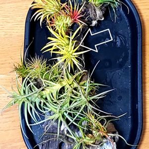 チランジアばかりを 着生させた 流木の 矢印で示した株 お迎えして4年目になる テヌイフォリア この子は 成長が遅い感じです❢ 昨年 水切れで かなり枯れ込み 傷んだ葉を カットしましたが それ以降も 余り大きく育たず いまだに養生中です💦