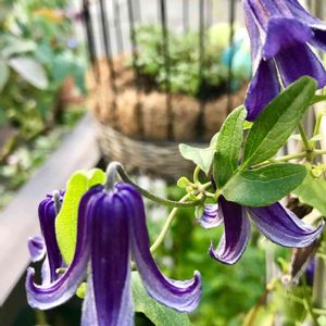 クレマチス ロウグチ ゆらゆらと風にゆれ、みんなで楽しそうです💜 ちょっとたこさんウィンナーにも見えるけど、 楽しそうなのが一番です(*´╰╯`๓)♬ 一度深く剪定しまして、また咲き始めました。 ご近所さんの人気者です🐙('-' 🐙)