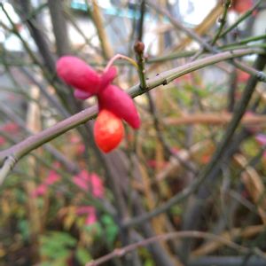 こんにちは☀ 青森県始め三陸沖の大地震に お見舞い申し上げます🥹 余震にもどうぞお気を付けて下さい🙏 昨日花友さんの錦木の紅葉の お写真を拝見して 私もと庭の境界際の錦木を 見に行きました 杖を忘れてしまって こここそ杖の必要な段差の激しい場所で ちょっと不安でしたが エイッと行ってしまいました その甲斐あって? もう葉は全部落ちてしまっていたものの 可愛い赤い実が僅かに残っていました ついつまみたくなるような実でしたが 調べてみるととんでも無いことでした トリグリセロールと云う有毒成分があり 鳥は大丈夫でも人間は絶対口にしては ダメたそうですよ! ニシキギ科の落葉低木