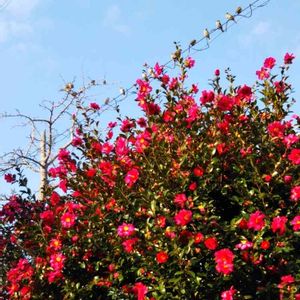 江の島で咲いている椿 (95) 『抜筆』(枝変わり紅花) 以前、抜筆を投稿しましたが(左下 3/25に投稿) 今回は抜筆の枝変わりで生まれた紅花の椿です。 枝変わりとは、自然に起こる芽条突然変異の事ですが、椿にはしばしば突然思いもよらない変化が起こるそうです。 江の島 サムエル・コッキング苑にて。