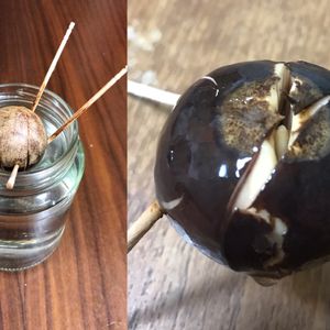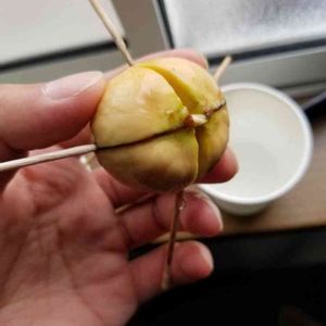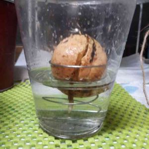 アボカドの根っこが種の外へ出てきました! 土に植えるのは芽が出てからの方がいいのかな?