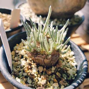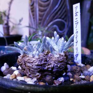 アボニア・クイナリア。 「赤花アルストニー」と札にありましたが、赤い花が咲くのはクイナリアだそうです。 今日は妻とファーマーズ三郷店へお出かけ。 妻はエケベリアを中心に何株かを。 自分はこのクイナリアを。 前にこのアボニアを池袋の屋上で見かけて色々調べてるうちに欲しいなと思ってました。 が、結構良いお値段。 BBでも数株見かけましたが手が出ず。 まーそういうのはボチボチ大きくて高いってのはあるんですが・・・。 今日は可愛らしい小さいのに出会えました。 塊根部は1cmくらいでしょうか。 かなり成長遅いみたいです。 お花咲かせるのは何年後になりますでしょうかw