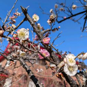 1本で紅白両方の花が咲くウメです。 いわゆる「咲き分け」と呼ばれる 「思いのまま」という品種です。 まだ咲き始めで分かりにくいですね。 でも紅白の割合は思いのままにはならず 毎年違うようです。