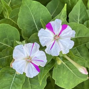 オシロイバナ(白粉花)four-o'clock または Marvel of Peru 咲きわけの色の入り方はどれも素敵・* オシロイバナ科 花弁に見える部分は萼(がく)で、花弁はない 名前の由来: 黒い種子の中の白い粉が、おしろいに似ていることから(白粉花) 夕方4時頃から咲き始めることから、英語で(four o'clock) ペルー原産であることから(Marvel of Peru)