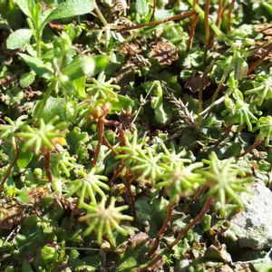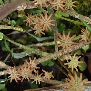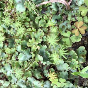 ゼニゴケです。雌器托、いわゆるカサが開いた状態でとても目立ち、分かりやすいです。カサの腕は8〜11本くらいでまちまちでした。 すぐ近くには雄器托を持った集団があったので、ゼニゴケ天国と化しています。
