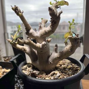 春の実生から一夏乗り越えて、立派に成長しました! 塊根好きには右の株が魅力的に見えるのでしょうね😀 休眠させて両方の枝を落とすと、更に分岐して重心の低い多枝に育つと思います。 左の株はカットする位置で表情が変わるので、慎重に高さを選ばなくては!
