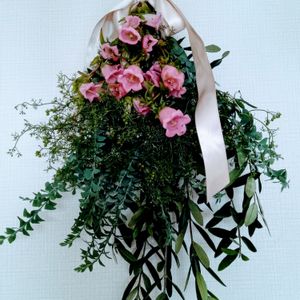 「スワッグ」作ってみました。 庭のオリーブをカット✂️したので、三角葉ミモザ、パクチー、2番花のカンパニュラを合わせてみました🤗💕