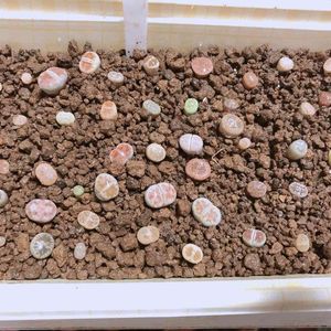 多肉:リトープス 脱皮萌え💞脱ぎ脱ぎと変化が見えるのが楽しいです🤭梅雨&夏に溶かさないようにしたいです。 品種おまかせのガチャ感覚で注文、リトープス福来玉を追加しました。1番大きくてしっかりしているように思えます😲 稚魚は1回目産卵で5匹、2回目産卵で10匹くらいが残りそうです🐟リトープスも魚も大きくなぁれ〜💎🐟✨✨