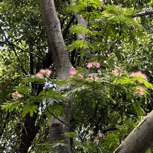 合歓木にピンク色のお花が咲いていました 暗くなると葉っぱが閉じるそうだけど、それはまだ観たことがありません 大木です🤳💦昼頃🕛