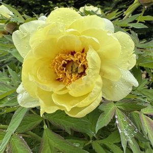 垣根沿いの黄色の牡丹が咲きました 数年前、根元にアリの巣を作られて瀕死の状態だった牡丹です 齧られた所を削って、土を盛ってなんとか復活 まだまだ元気が足りない枝は、葉も蕾も遅れ気味 今年、改めて土を盛りました