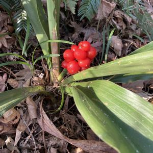 万年青オモト❤️ ユリ科 多年草 日本原産 1年ぶりの庭の掃除 斜面の落葉🍂を寄せると鮮やかな赤 心がパッとなります🥰