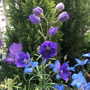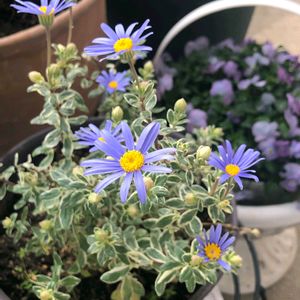 皆様機種変更の件では お騒がせしました😅 戻ることができました✨ ベランダのお花です🍀 ブルーデージー デルフィニウム💜💙🩵 シネンシス💜とチアブルー🩵💙