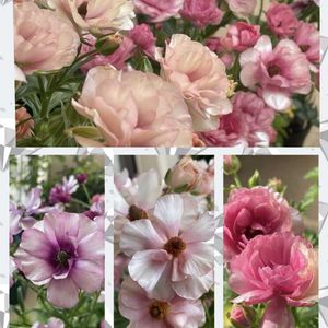 こんにちは☀️ 晴れて気温は急上昇⤴️😂暑いです 我が家でもラナンキュラスラックス咲いてます🤗🌸🌸 下段左からティーバ、アリアドネ、ヘラです💕3株ですが花数が増えてくれたので見応えあります😊 🏷️人に優しく 🏷️コラージュ仲間達に参加します