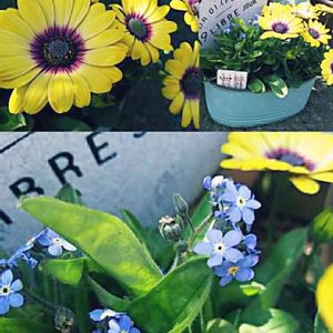 黄色が可愛いオステオスペルマムのブルーアイビューティーと忘れな草を一緒に植えました