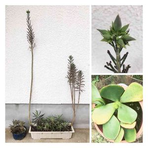 謎のシルエットに成長中の錦蝶さん(左) 蕾をつけました(右上) 周囲にばんばん子どもを落とすわひょろひょろ伸びるわで庭の片隅においやってしまっています😅 もう少ししたら夜間玄関組。 背の高い子は抜いちゃおうかなと思った矢先の蕾発見でした😅 紅覆輪の紅葉はまだのようです(右下)