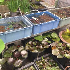 去年の植替えで札違いやらかしたのと、去年送ってもらったご縁睡蓮(チビ株過ぎてまだ咲いた事ない)容器をカラスに荒らされたり、寒波で分厚い氷が張った時に怪獣が氷取り出して植わってた株(生き残ってた葉が一緒に凍ってた)を引っこ抜かれて一部は容器の外で干からびてたりなんて事があり… (遠い目をしながら頬に涙がつたうくらいな心情…w) とりあえず大型ポット植えはそのままで、鉢植え水中ドボンは今週頭?に雨の合間に全部植替えたった〜っ!!w o(・`д・´。)ヵ゛ンハ゛ッタ ‼︎ 今シーズンは品種特定すべく! 全部の容器に番号付きの札挿して準備完了! ドボン容器は元々所有株とご縁株は植えてる容器が違うからさらに混乱せずに助かったけど、ご縁株の方が種類多いしまだ花すら見た事ない子達だから特定するだけでも大変でもあるw ドボン容器は植替えの時に不要な根は取り除いたから咲くのはまだ先だしなw (蕾付きは2株あったけど、その蕾が咲くかはわからぬw) ってな事で、本日黒の大型ポリポット直植え(左側)に1つ赤系の蕾を発見! 何が咲いてくれるかは咲くまで分かりまてんw (去年の画像チェックしててワンビサだと思うけど…この鉢だったかすでに忘れたわぃw) ■睡蓮
