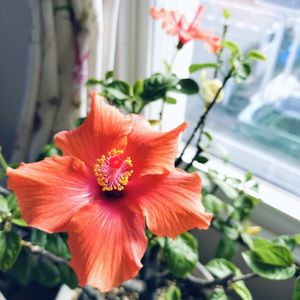 こんにちは😊 今日は穏やかなよい天気です☀ 🌺ちゃん2輪咲きました🧡 まだ蕾がついてます。